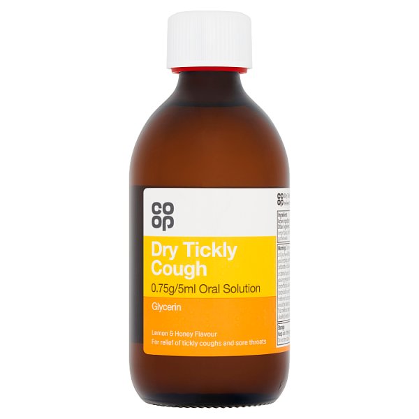 Dry tickly cough 0.75g/5ml oral solution is taken to relieve the symptoms of tickly coughs and sore throats.